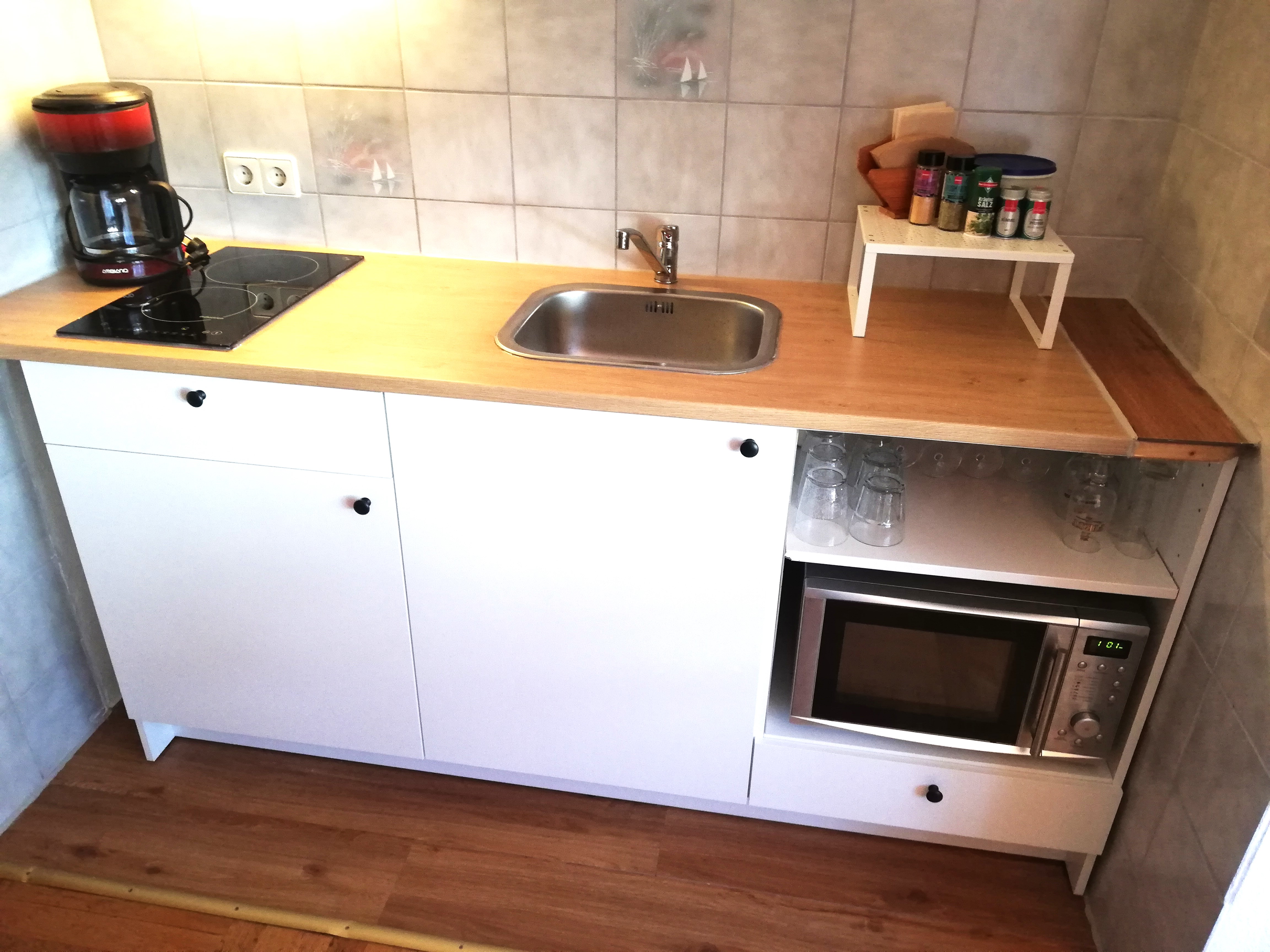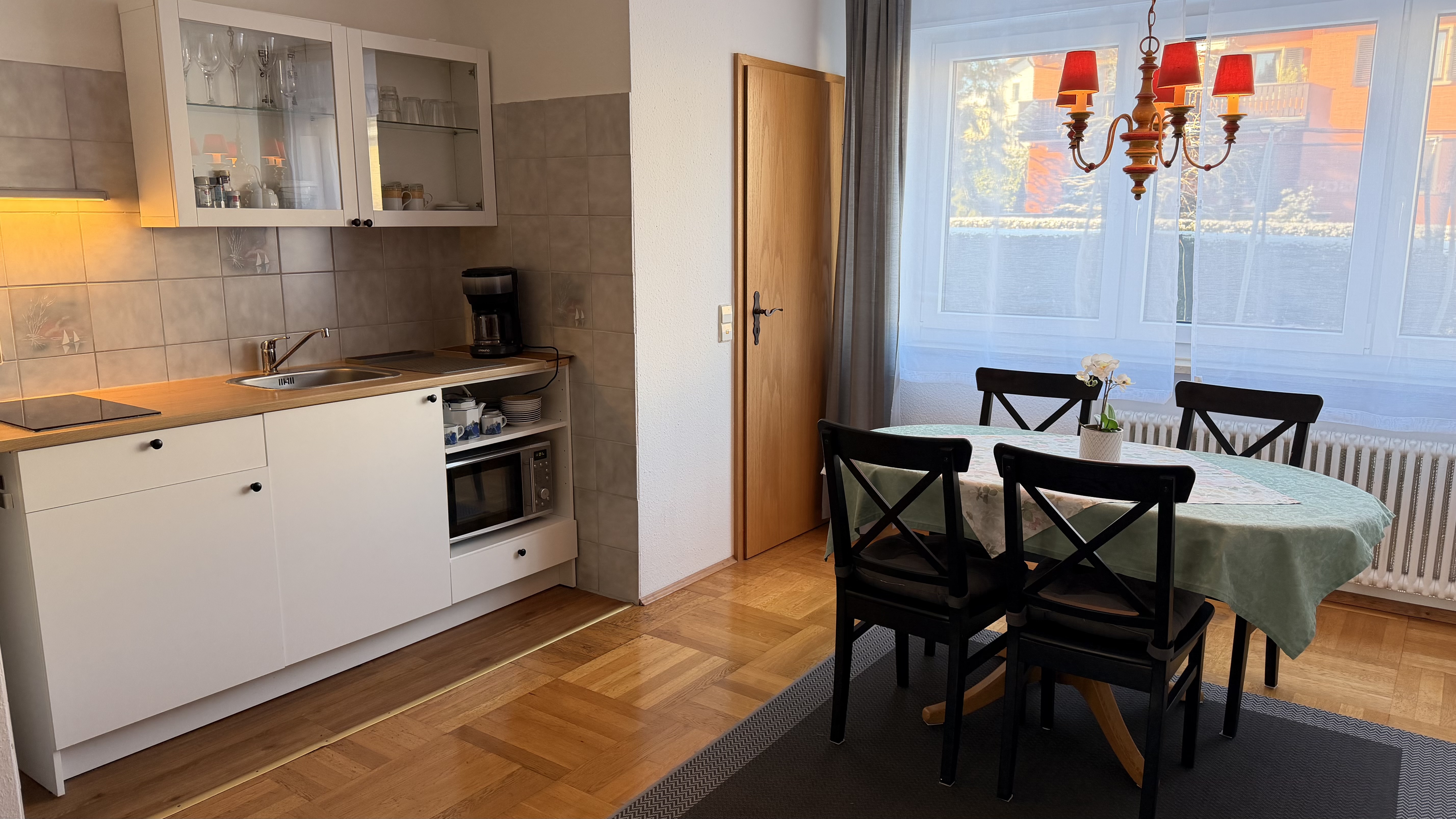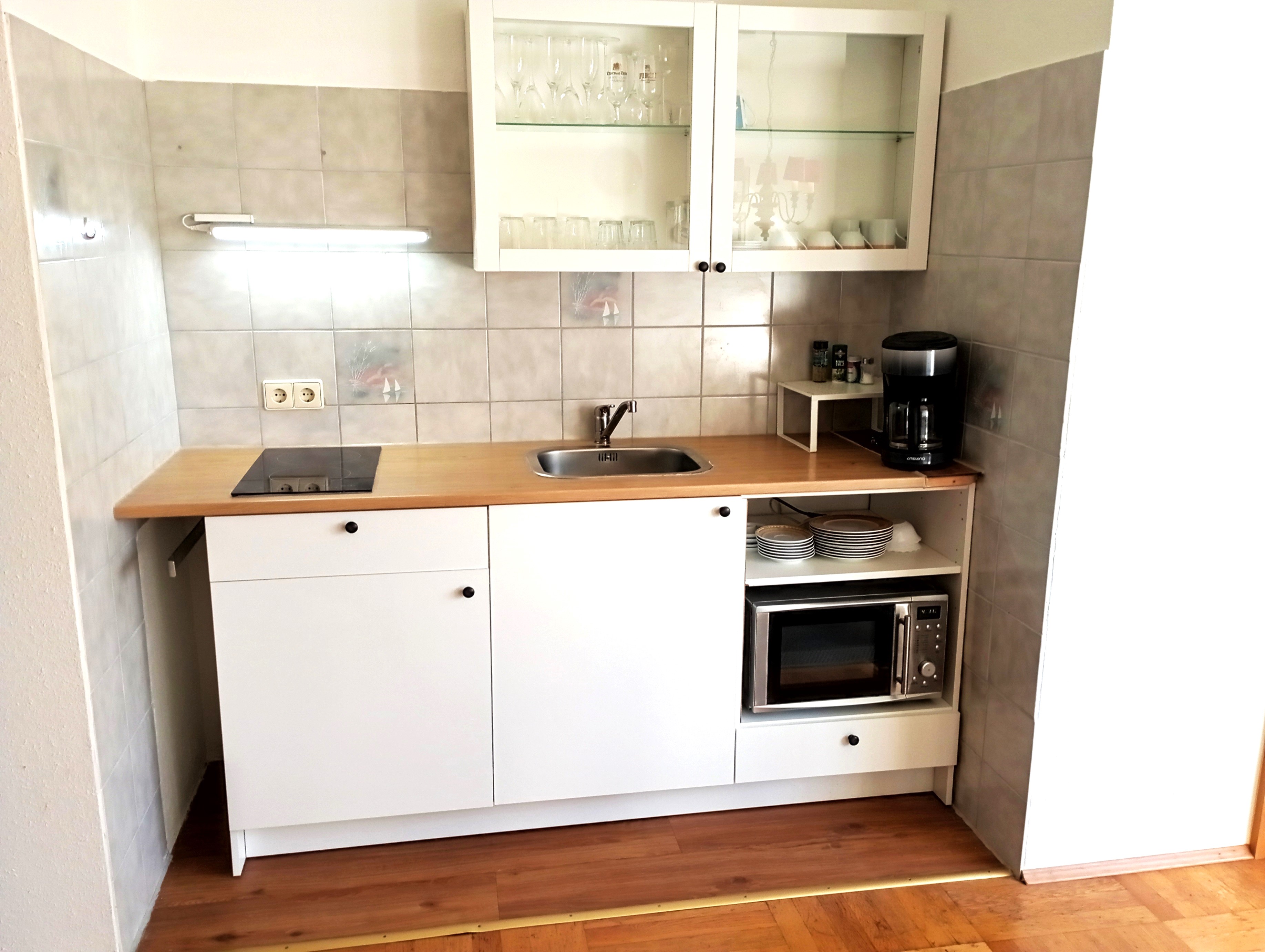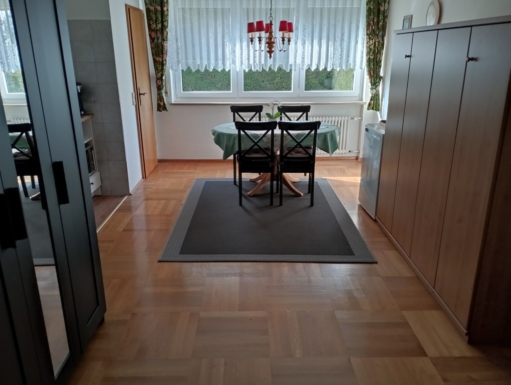 Die Ferienwohnung kann mit bis zu 4 Personen belegt werden. Sie besteht aus einem Wohn-Schlafraum, Couch, TV und einem Ess-Schlafzimmer mit einer komplett eingerichteten Küche, Kühlschrank, Herd, Minibackofen, Kaffeemaschine, Mikrowelle, Wasserkocher, Toaster und ein großzügiges Angebot an Geschirr und Töpfen.