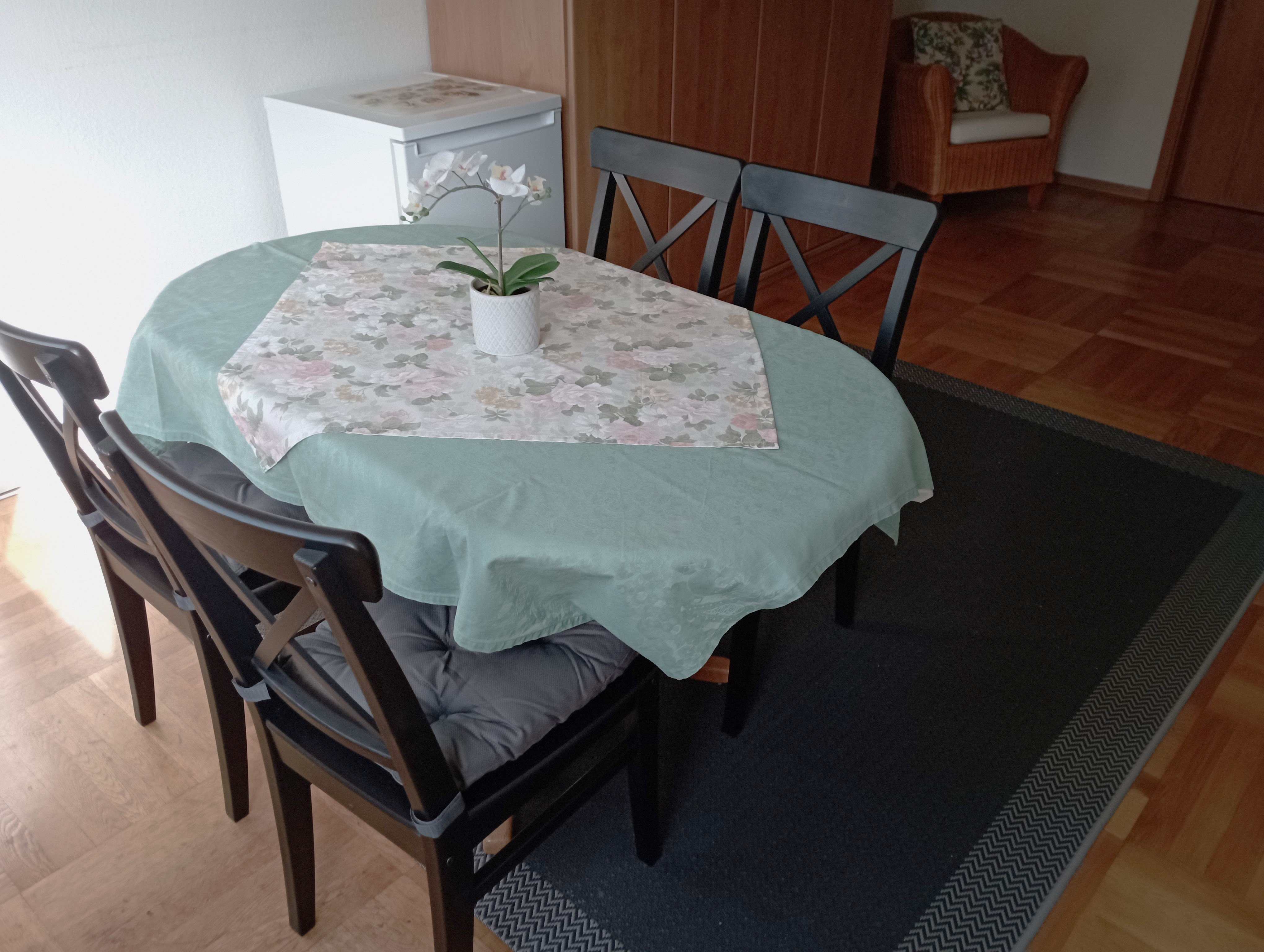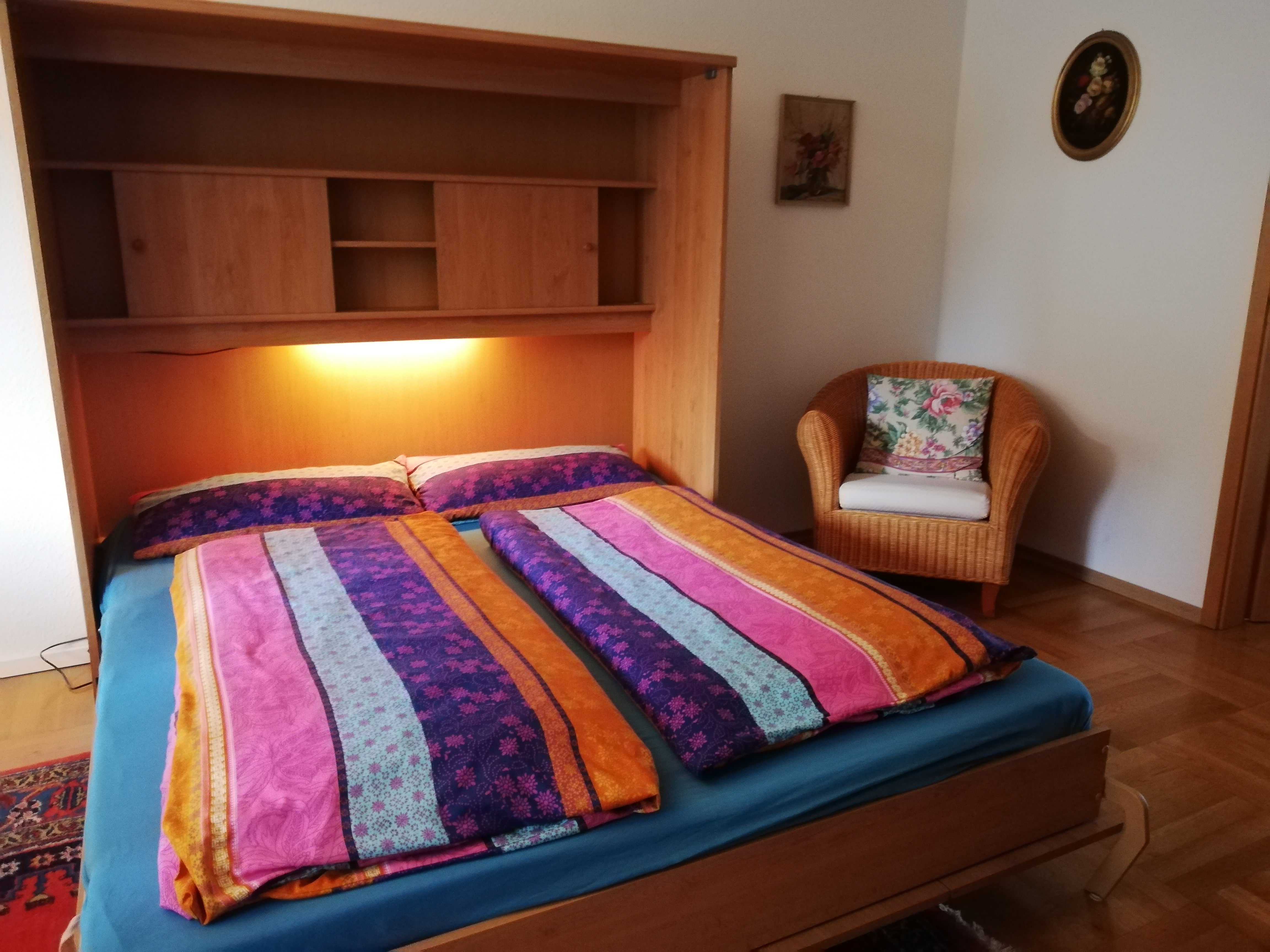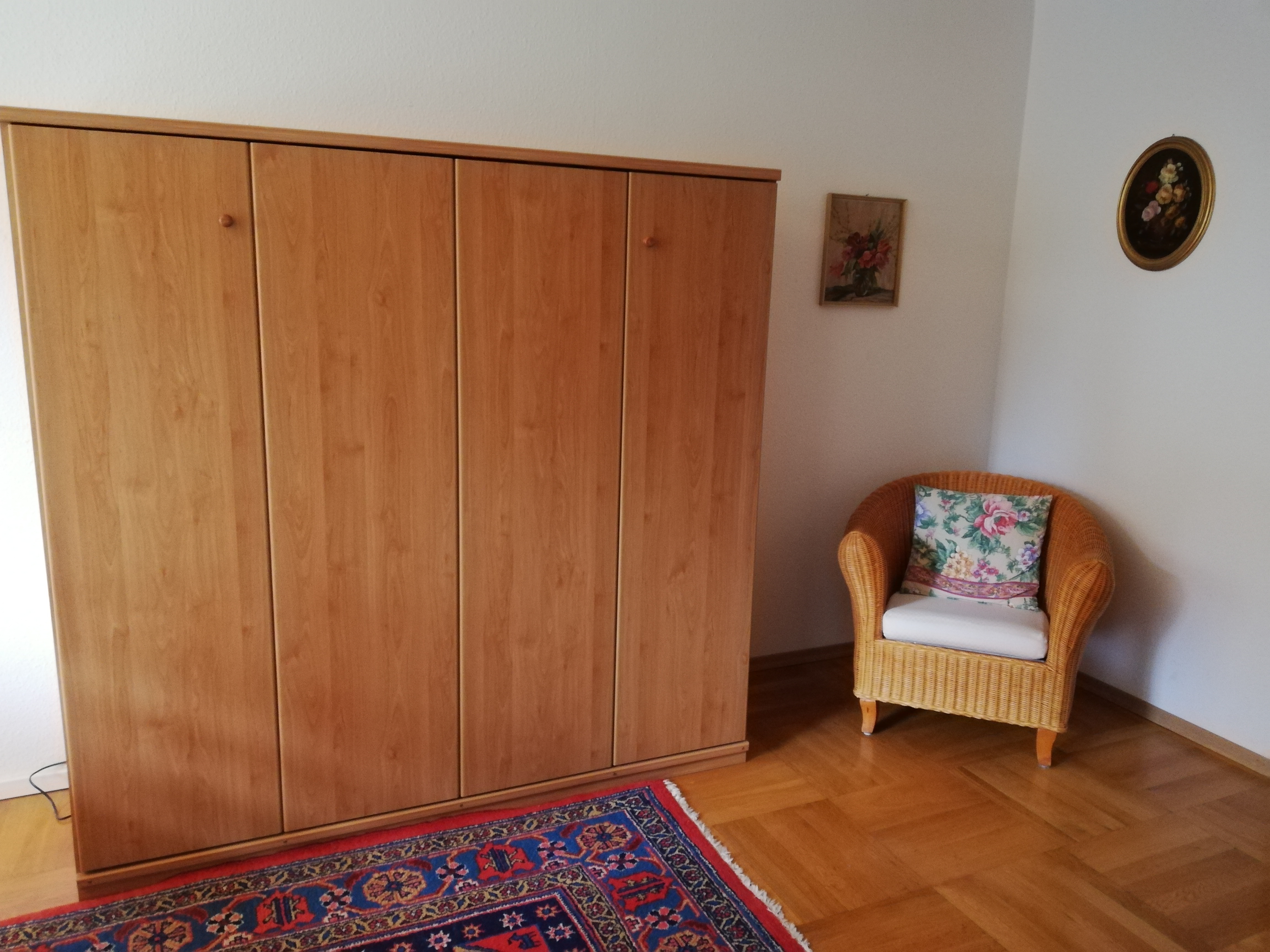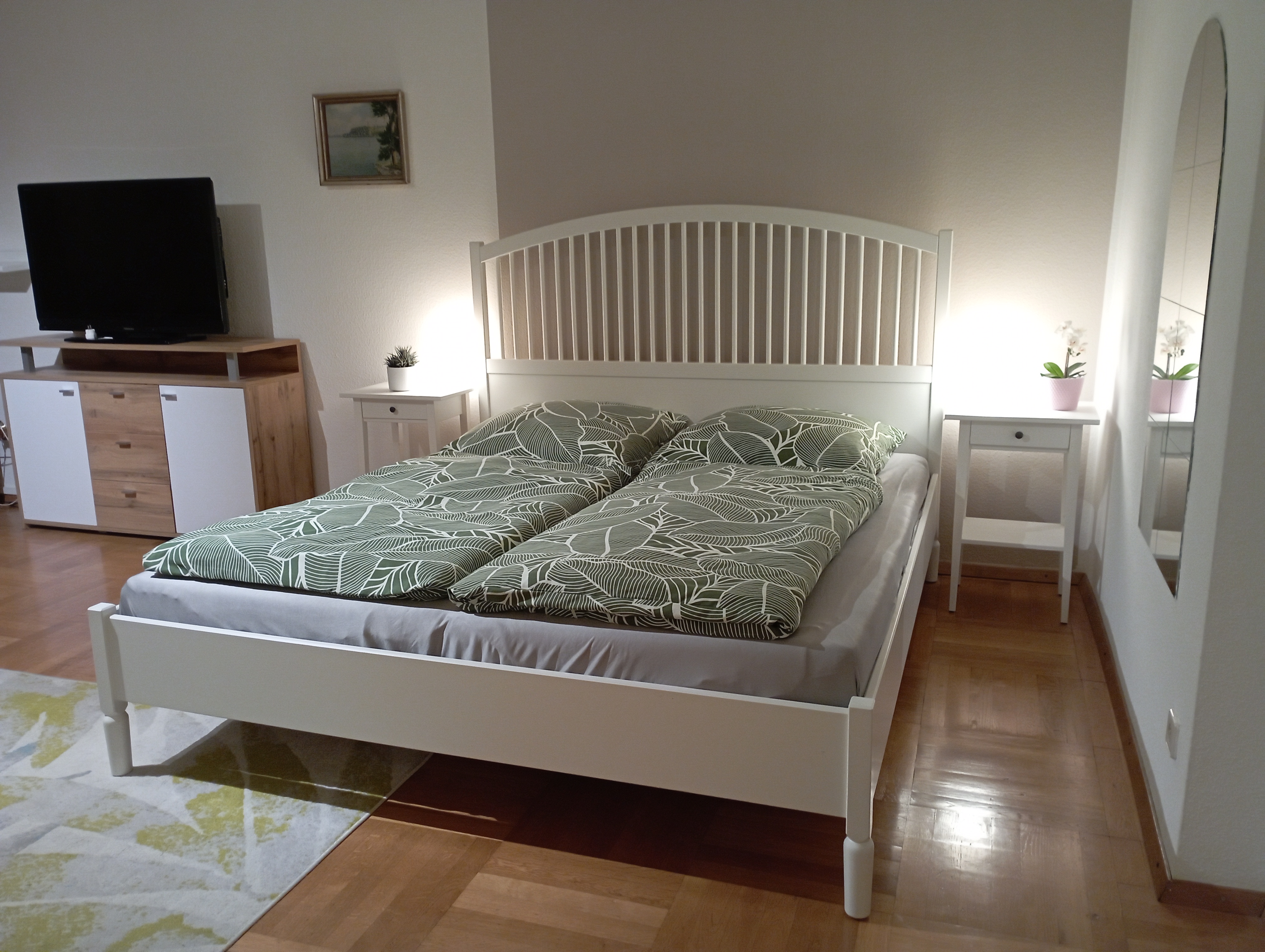 Die Ferienwohnung kann mit bis zu 4 Personen belegt werden. Sie besteht aus einem Wohn-Schlafraum, Couch, TV und einem Ess-Schlafzimmer mit einer komplett eingerichteten Küche, Kühlschrank, Herd, Minibackofen, Kaffeemaschine, Mikrowelle, Wasserkocher, Toaster und ein großzügiges Angebot an Geschirr und Töpfen.